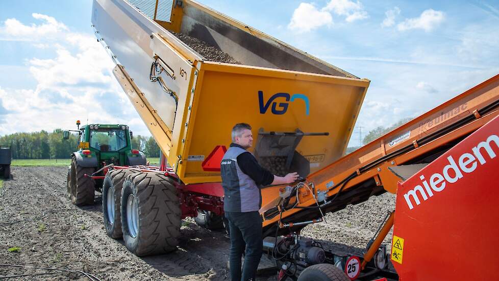Op bijgaande foto’s, die dateren van afgelopen week, zien we een Schuitema die volop in actie is op zijn combinatie met een John Deere van 250 pk. Hij geeft aan dat hij op het land nog volop last had van de sporen die er nog zijn van de bewerking tijdens het afgelopen natte najaar. Dat hoeft volgens hem niet per se nadelig te zijn voor de oogst van dit seizoen. „De natuur herstelt zich snel, maar dan hebben we dit jaar wel een goed groeiseizoen nodig en we hopen daarbij de phytophthora goed buiten de deur te kunnen houden.”