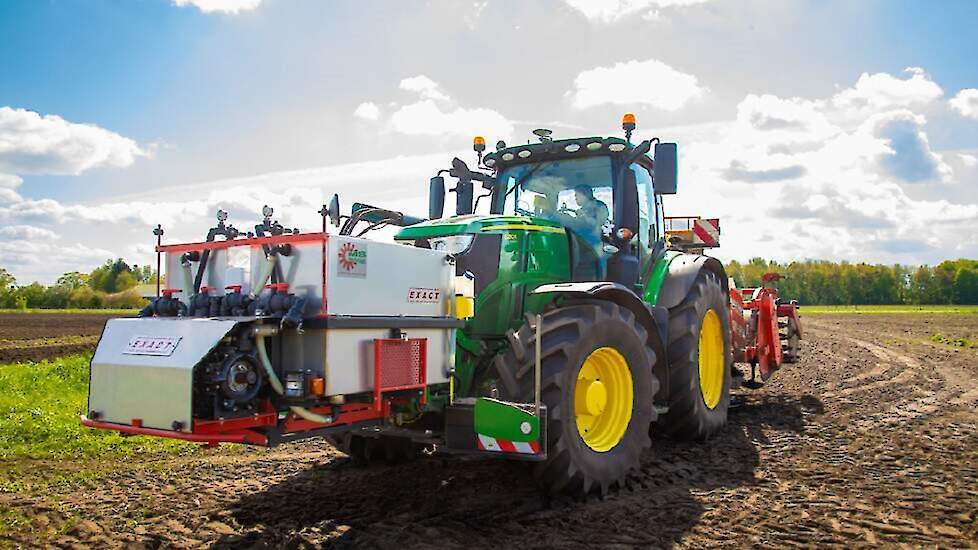 De vertraging door het natte voorjaarsweer valt op zich wel mee, constateert Schuitema: twee weken. Hij moet nog drie kwart van zijn aardappelen poten. Deze maken een derde van zijn bouwplan uit. De rest bestaat uit een derde graan en een derde suikerbieten en uien. Bij het poten van de aardappelen voegt Schuitema ook nog Amistar toe, tegen Rhizoctonia.