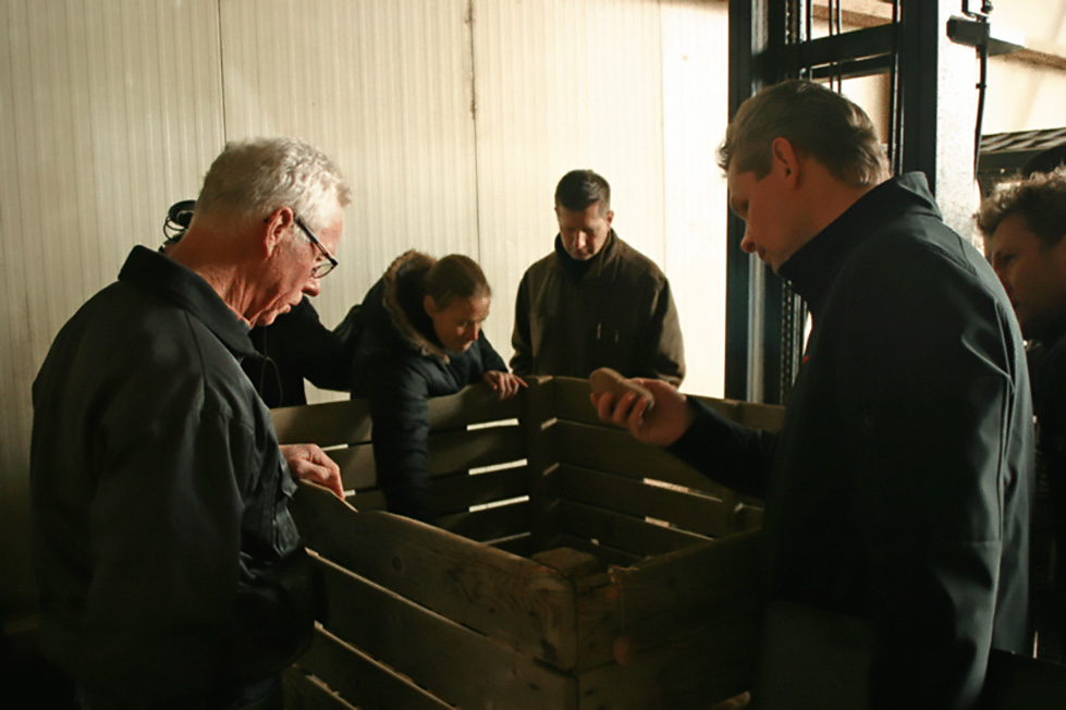 Harry Terpstra bekijkt samen met de andere juryleden hoe schoon het pootgoed is van Remko van Wieringen uit Finsterwolde. Tweede van rechts is adviseur Hendrik Jan Boven van WPA Robertus