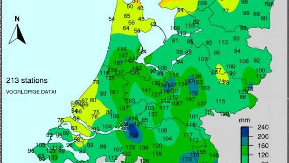 In de omgeving van de Biesbosch is deze maand tot 235 mm neerslag gevallen, maar ook in zuid-Limburg en midden-Gelderland hebben akkerbouwers het flink voor de kiezen gehad. In diezelfde maand hebben akkerbouwers in het noorden van Friesland plaatselijk nog geen 20 mm regen gehad.