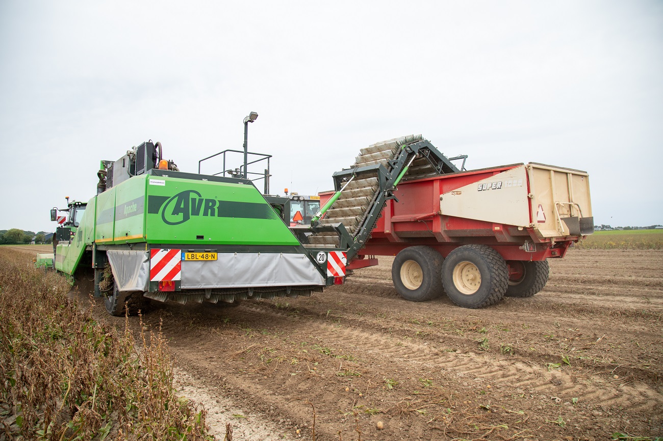 Hij rooit zijn aardappelen met een vierrijige AVR. Aan de voorkant van de trekker hangt een loofklapper met zijafvoer. „Zo heb ik altijd een schoon rooibed.”