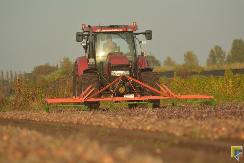 Bijkomstigheid is dat het de uien ook weer netjes in het zwad legt. ‘We hebben behoorlijk last gehad van roeken, die hebben het zwad op z’n kop gelegd’, zegt Izebrand Haaijer.