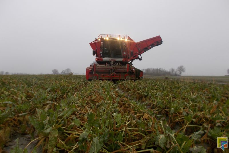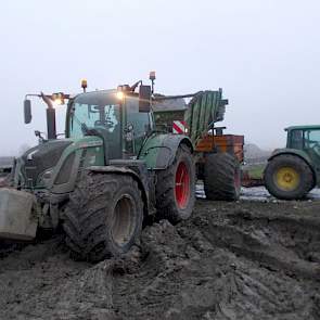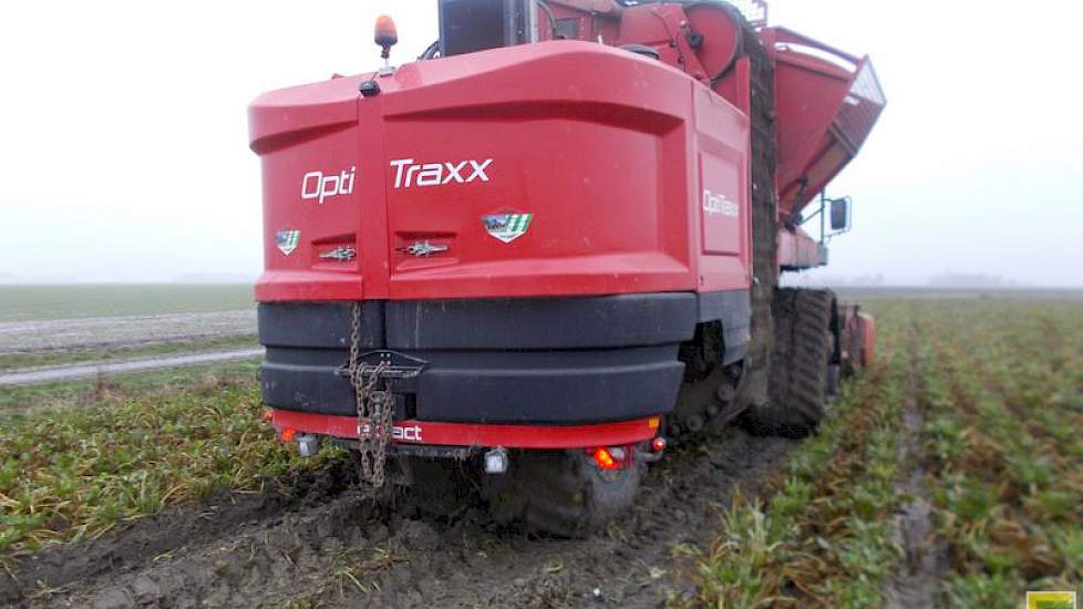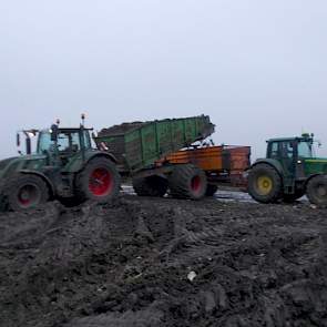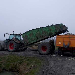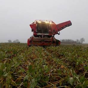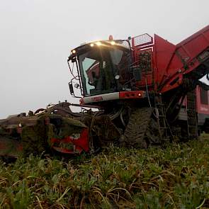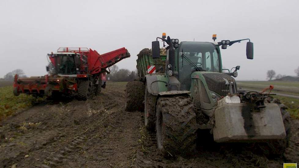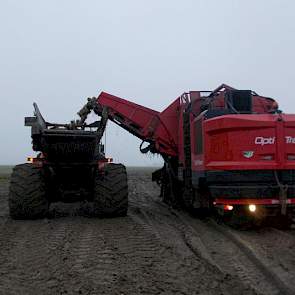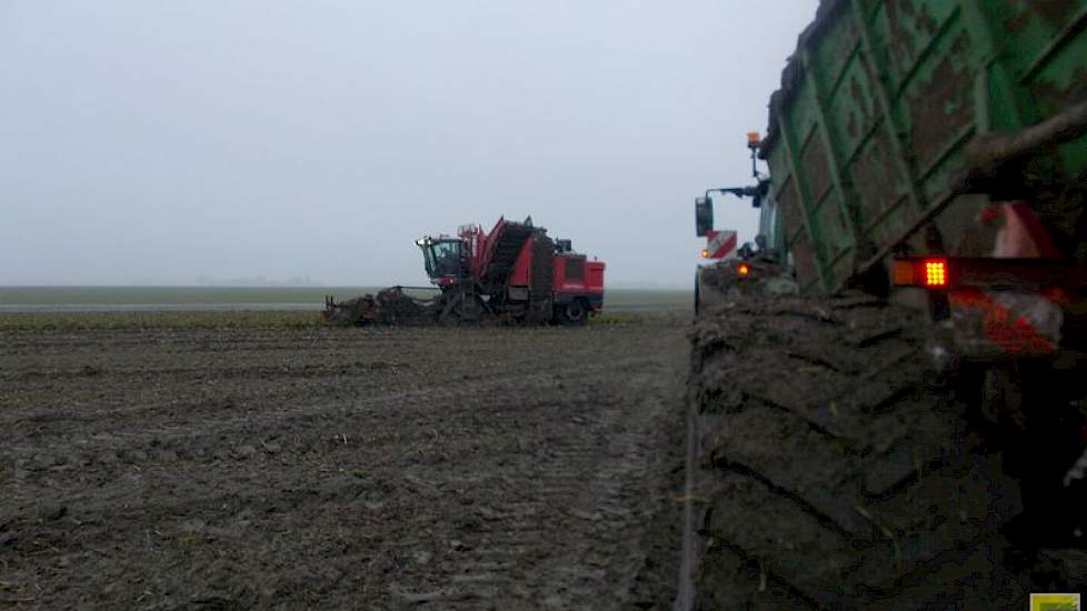 Loonbedrijf Voshart en Veltman uit Stedum (GR) rooide enkele dagen geleden zijn laatste bieten. Op een perceel van akkerbouwer Burema bij Oldenzijl rooide mede-eigenaar Jan Voshart de bieten met zijn Agrifac Exxact OptiTraxx, zijn zoon Gerjan reed op de overlaadwagen. Deze combinatie kon goed overweg met het natte perceel, zegt Voshart. ‘Het rooien verliep vlekkeloos.’ De overlaadwagen en de trekker reden op een lage bandenspanning. De overlaadwagens dumpten de bieten vervolgens in de kippers van de akkerbouwer, die klaar stonden op het naastgelegen betonpad. De opbrengst leek volgens Voshart goed. ‘Het waren net voederbieten, zo groot waren ze.’