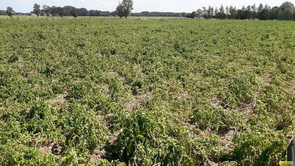 Volgens Van Wenum heeft de al weken heersende droogte nu al een flinke impact op de komende oogsten in het hele land. „Dit heeft een behoorlijk opbrengsteffect. Ik reken op aardappelopbrengsten die 20 tot 25 procent kleiner zijn dan vorig jaar.” Van Wenum heeft het perceel in Kootwijkerbroek dit jaar voor het eerst gehuurd. „Ik kan hier niet beregenen. Het was een van mijn de vochtigste percelen. Ik heb er daarom juist een vroeg ras op gezet zodat ik hier op tijd weg was, maar uiteindelijk verdroogt het. Dit wordt echt een halve opbrengst met een kleine sortering. Het is te hopen dat de prijzen van aardappelen en uien dit jaar stijgen.”