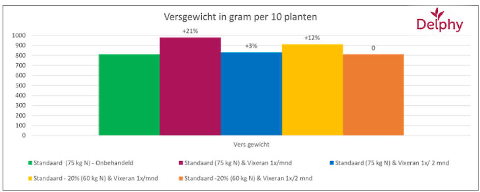 Ook bij de gereduceerde stikstofgift (60 kg) werd bij maandelijks van het middel toepassen 12% meer versgewicht gemeten ten opzichte van de standaard bemesting van 75 kg stikstof niet behandeld.