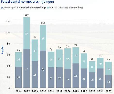 Monitoring door Rijnland in het agrarisch meetnet laat overigens wel een daling zien van het aantal normoverschrijdingen ten opzichte van 2024, maar het hoogheemraadschap stelt dat er afgelopen jaar meer hoge piekconcentraties zijn gemeten. Die zouden volgens Rijnland acuut een schadelijk effect hebben op waterorganismen.