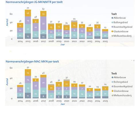 Binnen het beheergebied van het Hoogheemraadschap Rijnland is zo’n 45.000 hectare in agrarisch gebruik. Het gaat om akkerbouw (aardappelen, bieten, granen, maïs, en overige landbouwgewassen), bollenteelt, boomteelt, glastuinbouw en grasland (veehouderij). In al deze gebieden zijn normoverschrijdingen gemeten, vaak zijn dit stoffen die worden gebruikt in de betreffende teelt. Alleen in het boomteeltgebied is het aantal normoverschrijdingen in 2025 lager dan in 2023 én 2024.