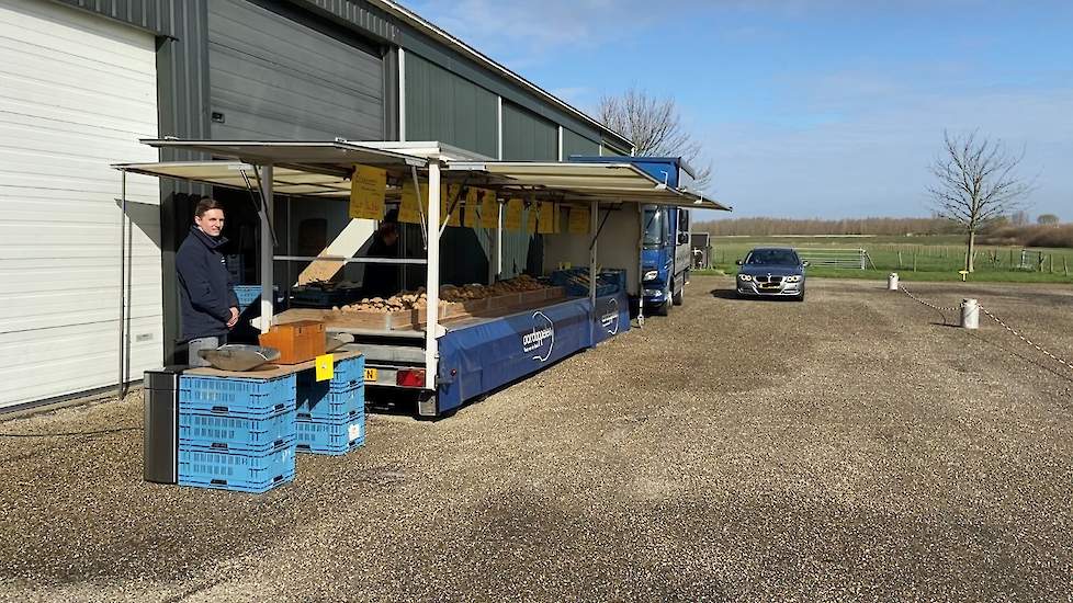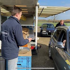 Op het erf is met pijlen de aanrijroute uitgezet, zodat de klanten met hun auto pal voor de kraam langs kunnen rijden. Als de klant zijn keuze heeft gemaakt, kan hij twee meter doorrijden naar de pinautomaat om contactloos te betalen. Ondertussen legt Van der Beek de gekochte waar in de auto.