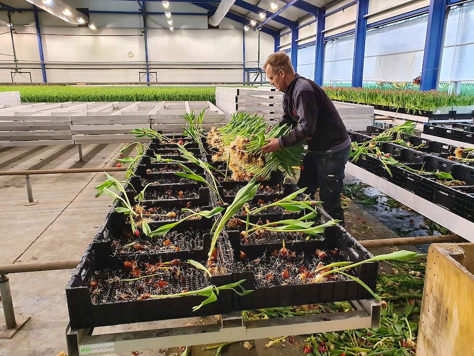 Het plukseizoen voor de tulpen uit de broeierij - 1 januari tot en met half april - is in volle gang. Van de 5,5 miljoen tulpen die ieder seizoen worden geplukt in de kassen in Loppersum staan er nog zo’n 2 miljoen. „Deze kan ik nu allemaal weggooien.” De medewerkers gooien armen vol bossen in kuubskisten. „Daar krijg je de tranen van in de ogen”, verzucht hij. „Het is een mooie partij, de bloemen staan er perfect bij. En het enige wat je kan doen is ze weggooien.”