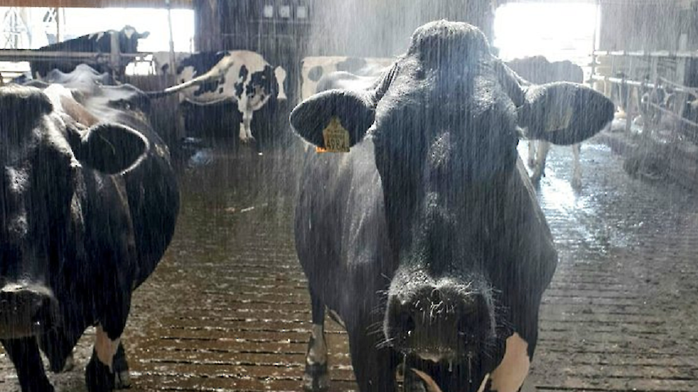 De koeien van melkveehouder Klaas Wolters uit Winsum (GR) genieten onder een flinke koeiendouche.