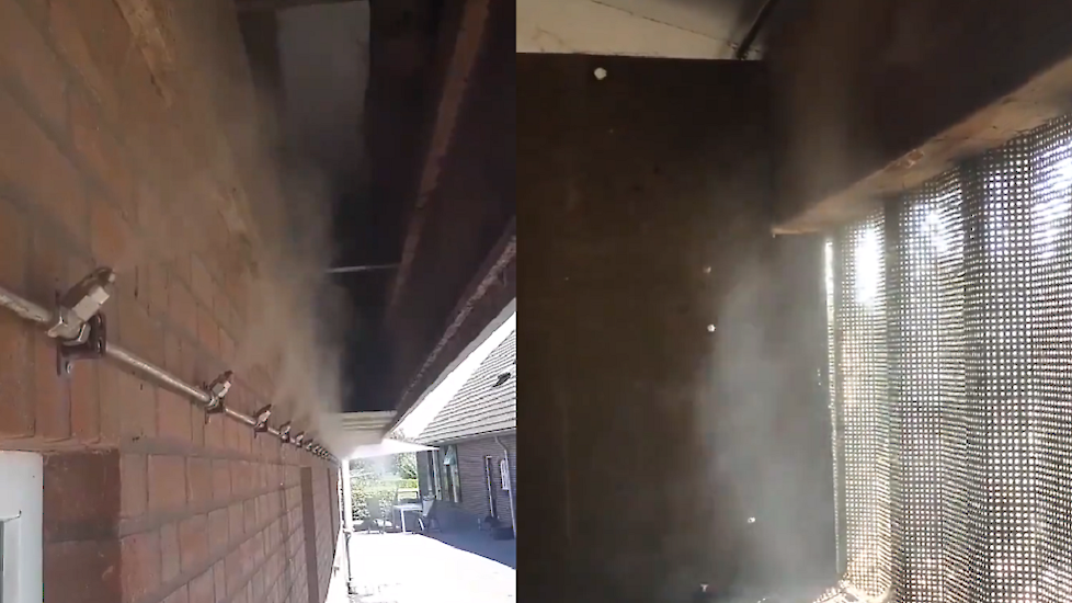 De afgelopen weken heeft fokbedrijf Krabben in Mariënvelde (GD) alle drie locaties voorzien van een hogedruk nevelinstallatie. "Deze zetten we aan op warme dagen. De lucht die de stal in komt is koeler door de koude nevel, daardoor kunnen we het in de stal aangenaam houden, voor mens en dier", schrijft het bedrijf op Facebook. Beeld: Fokbedrijf Krabben