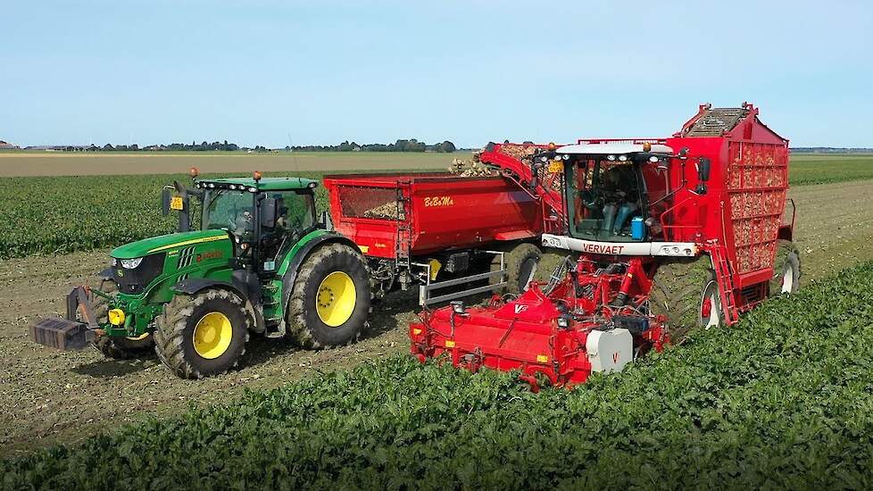 Loonbedrijf Boven uit Finsterwolde (GR) zit sinds medio vorige week weer volop in de bieten. Met hun twee rooiers - zesrijige Vervaet 617 - is het nu al volle bak oogsten, zodat telers tijdig hun bieten op de hoop hebben liggen, zegt Reinie Boven. De bietencampagne gaat morgen van start. Cosun Beet Company koerst vooralsnog op een wortelopbrengst van 82 ton en een suikeropbrengst van 13,8 ton per hectare. Daarmee wordt het geen topjaar.