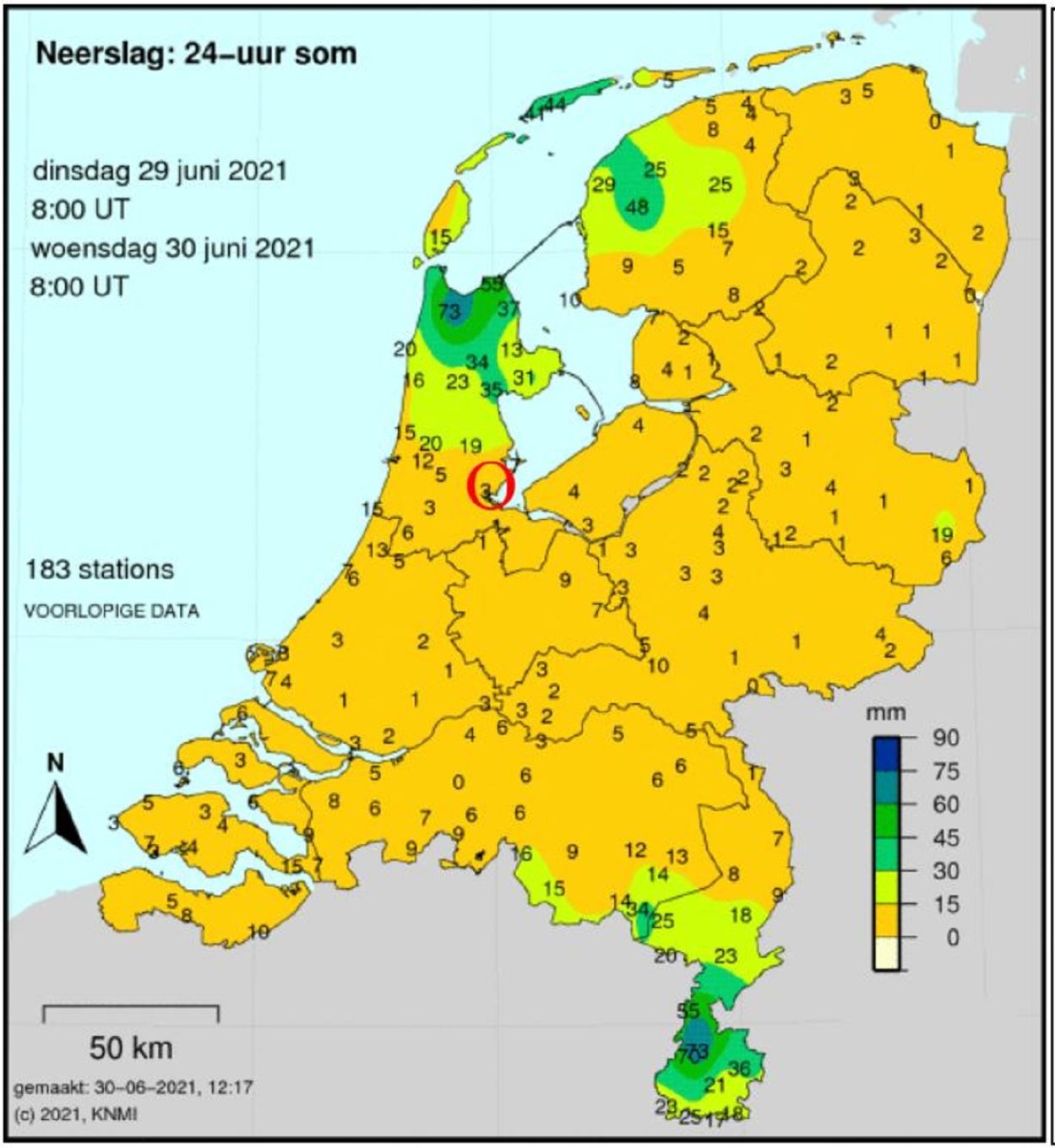 In andere delen van het land viel de afgelopen weken beduidend minder water, zoals onderstaande kaart laat zien. Zo viel in de maand juni in delen van Groningen en Noord-Brabant nog geen 40 mm neerslag. Om de gewassen toch van voldoende vocht te voorzien, zijn her en der de beregeningshaspels weer in het land gezet.