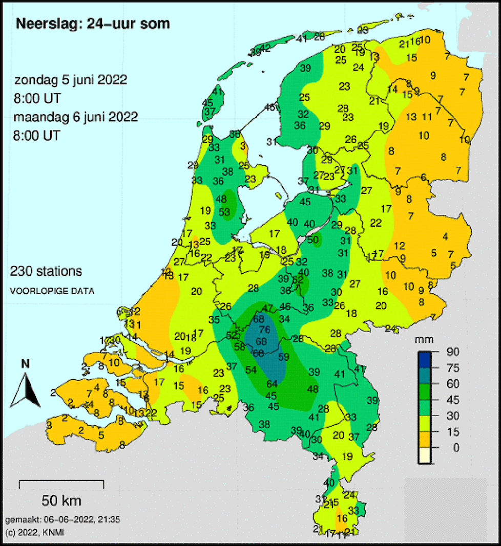 Vooral in het midden van het land viel veel regen, zo blijkt uit meetgegevens van Weeronline. Onder meer Utrecht, het westen van Gelderland, Flevoland en Noord-Holland kregen de afgelopen dagen veel neerslag. Geldermalsen was volgens Weer.nl officieel de natste plek met 76 mm.