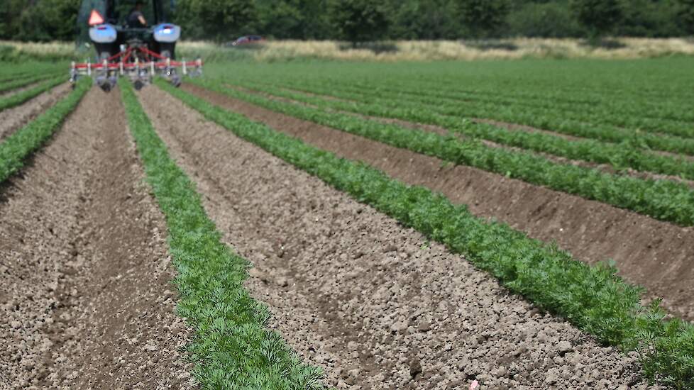 Atilla, één van de Roemeense medewerkers van het biologische akkerbouwbedrijf Bio Boerma uit Zeewolde (FL) schoffelt de peen. Het schoffelen gaat vlot dankzij een lage onkruiddruk.