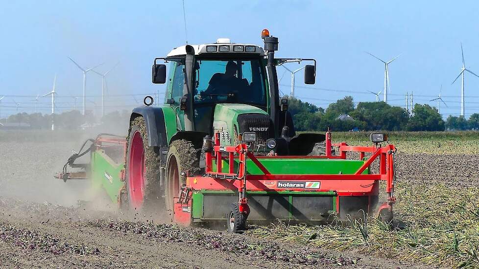 Onder droge omstandigheden rooide een medewerker van akkerbouwbedrijf Bakker Bierum in het gelijknamige Groninger dorp recent rode uien. De uien worden gerooid met een Holaras rooier en loofklapper. Bakker Bierum is een akkerbouwbedrijf met circa 620 hectare grond. De belangrijkste gewassen op het bedrijf zijn aardappelen, winterpeen, uien en graan.