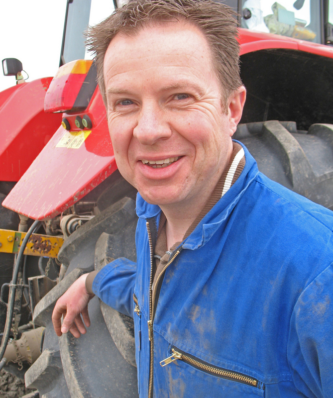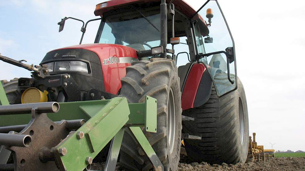 De akkerbouwer heeft opvallende achterbanden onder zijn trekker. Het zijn grasbanden die van een veehouder zijn geweest. 'Ze zijn mooi breed, maar hebben weinig tractie. De voorwielaandrijving moet flink meehelpen.'